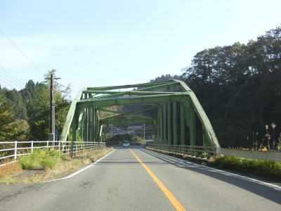 | R445三和交差点から程なくして熊本r153交差点を通過するが、案内標識のr153の行き先は消されている。家屋が点在する中を走っているとやや急な左カーブを曲がって霊台橋を渡って右カーブを曲がる。下流側に架かっている霊台橋は1847年、つまり明治時代よりも前に造られた橋である。かつては車両も通っていたようだが、現在は歩行者のみとなっている。 | ||
