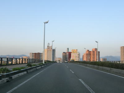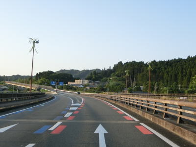 | 空港ランプを通過すると右にカーブして進行方角を東から南に転じ、勾配を下って平面道路状態になる。と同時に市道との内蛎原交差点を通過する。源藤交差点以来の信号付きの交差点だが、以降は市道との交差箇所にいくつか信号機が設置されている。信号機の設置されていない交差点もある。勾配を上ってから清武川に架かる木崎大橋を渡り、サンマリンスタジアムの横を通り過ぎる。 | ||