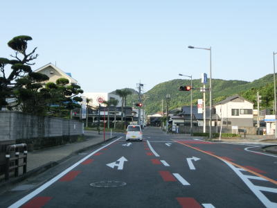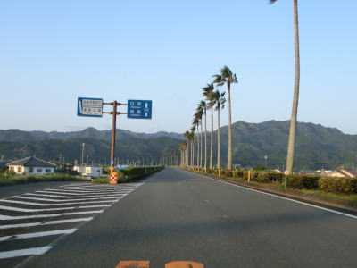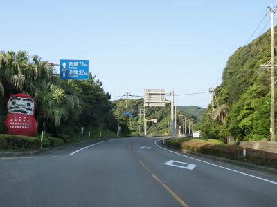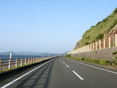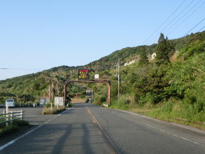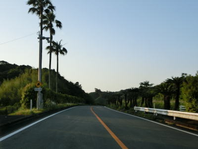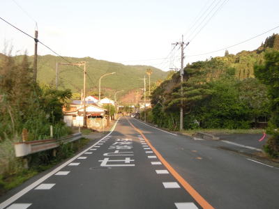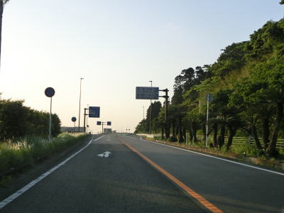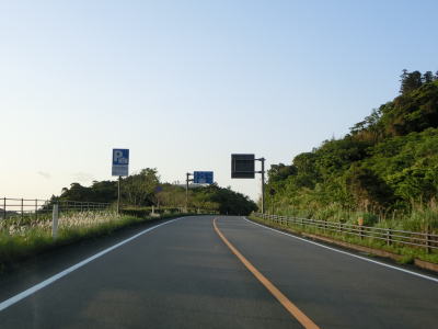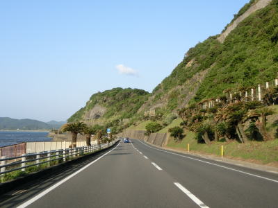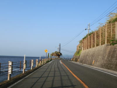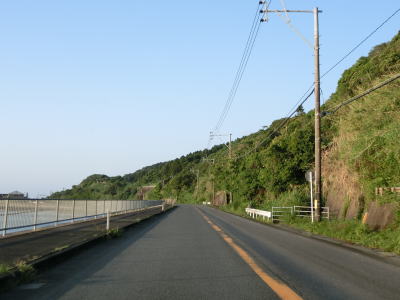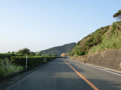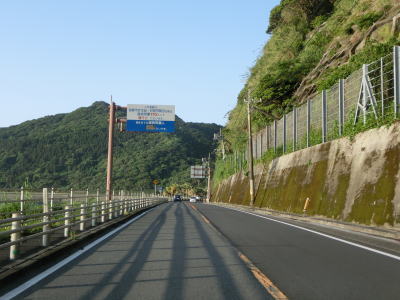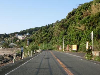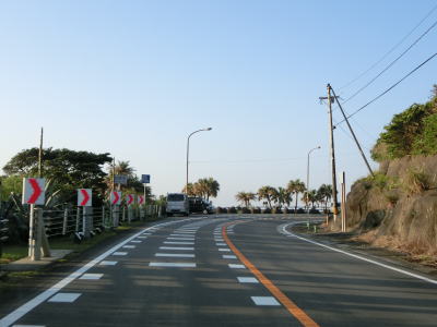 | 海に沿った対面2車線道路を淡々と走る。ゴールデンウイークとは言え早朝とあって交通量は少ない。海岸は青島の隆起海床と奇形波触痕と呼ばれており、通常の砂浜ではない。小内海集落を通過すると山の斜面の別荘地の下を通る。 | ||