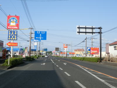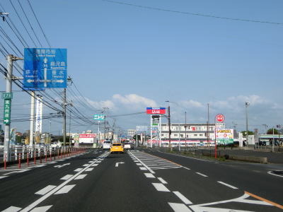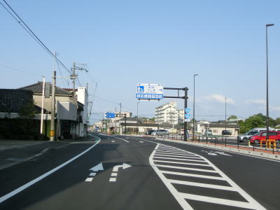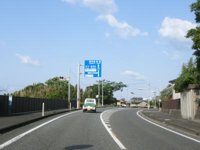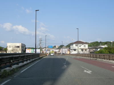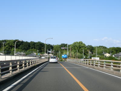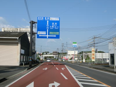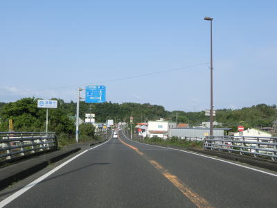 | 安楽橋から少し走るとカバーが架けられた案内標識が確認できる。これは2021年夏頃に開通予定のE78東九州道の志布志有明IC(仮称)の案内標識と思われる。市街地から離れているが意外に多くの商業施設が建っている中を走っていると菱田橋を渡る。 | ||