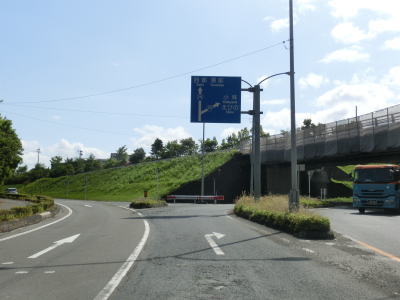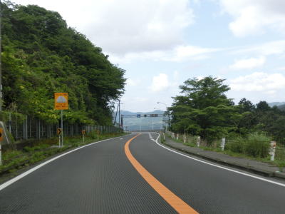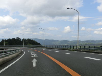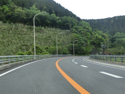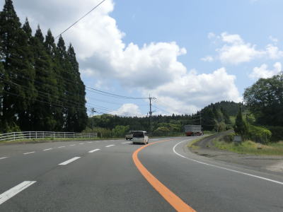 | えびのループ橋を通り過ぎてからも下り勾配が続いている。等高線に沿ってカーブの多い旧道とは異なり、緩やかなカーブばかりで走りやすい。長い勾配が続いているが、上りとなる北向き車線には登坂車線が設置されていない。 | ||