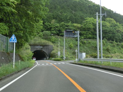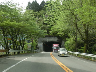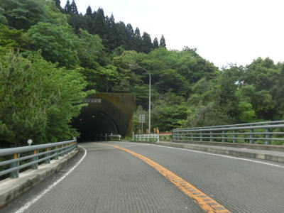 | 2車線道路を上り続けていると久助谷を渡った直後で加久藤トンネルに入る。全長1809mのトンネルで、200番代国道とあって開通年は1972年(昭和47年)と結構古い。すぐ西に九州道の同名のトンネルがあるが、こちらの延長は上りが6260mで下りが6255mである。上下ともに5kmを超えているため危険物積載車両の通行ができず、R221が迂回に利用される。それ故R221のこの区間は大型トラックやトレーラーの通行が多い。なお、旧道の峠は鹿児島県寄りにあり、名称は堀切峠となっている(スーパーマップルでは括弧書きで加久藤峠としている)。 | ||