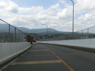 | 旧道のガードレールを見ながらやや急な勾配を下る。反対側の登坂車線がなくなると大きく左にカーブしている。雲海トンネルを上を通っており、えびのループの中に入った事になる。霧の大橋からはえびの市街地を望む事ができ、また前方の山頂には海上自衛隊のえびの送信所のアンテナが見える。アンテナと言っても周波数がVLFのため最大で地上高270mの鉄塔が8基も設置されている巨大なものである。 | ||