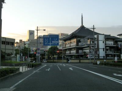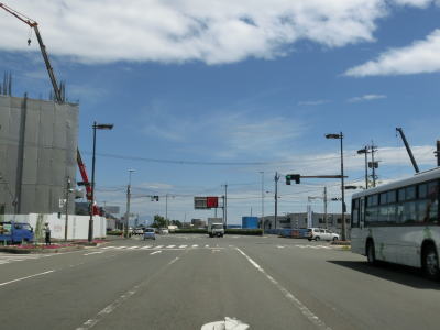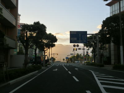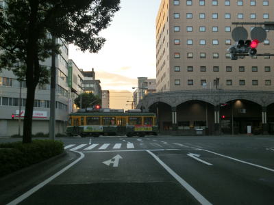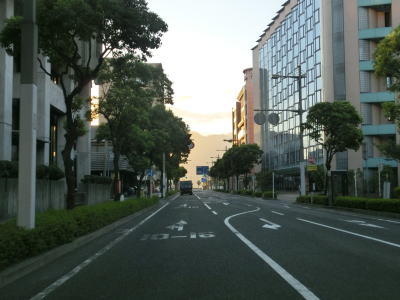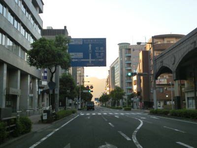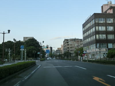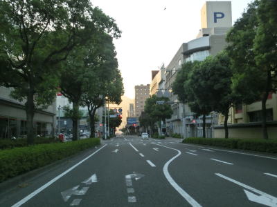 | 中央公民館前交差点から約300mで市道との朝日通り交差点を通過する。市道には路面電車の鹿児島市電が走っており、交差点の南に市役所・鹿児島駅方面の電停が、北に天文館・鹿児島中央駅方面の電停が置かれている。ちなみに鹿児島市電は路面電車ではあるが、交差点等を除いて芝生敷きとなっており自動車では走行できない。そのため路面電車が苦手なドライバーでもさほど気にせずに通行できるだろう。 朝日通り交差点からも交差点の多い状況が続いている。時間帯によって一方通行となる道路もあるため、時間によって国道から右折もしくは左折できない交差点もある。写真では交通量が少ないように見えるが、これは早朝に走っているためで昼間であればもっと多くの車両が走っている。 |