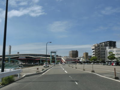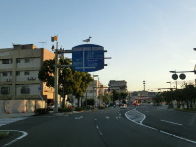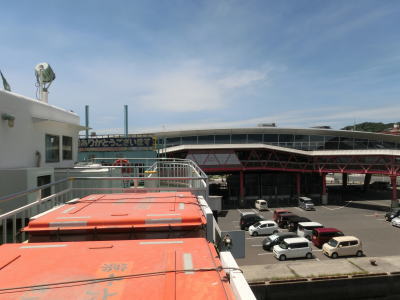| その後は一方通行の2車線道路を岸壁に沿って走り、フェリーターミナルの西から南にかけて回り込むように進む。この2車線の道路は乗船待ち場所を兼ねているので日時や曜日によっては長い列ができている可能性もある。なお、桜島フェリーは鹿児島市が運営している公営企業で、24時間運行(1〜4便/時間)されている。そのため繁忙期を別にすればさほど混雑もなく乗る事ができると思われる。 | ||