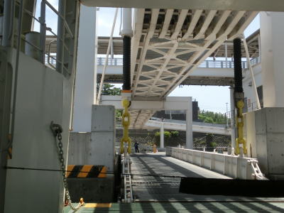 | 12.岸壁沿いを走る | 13.車両甲板は2層構造 | 14.船上からフェリーターミナルを撮影 |