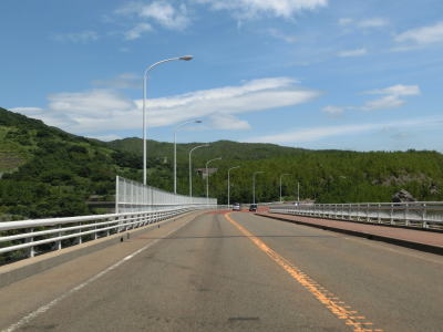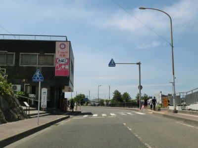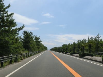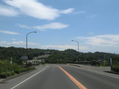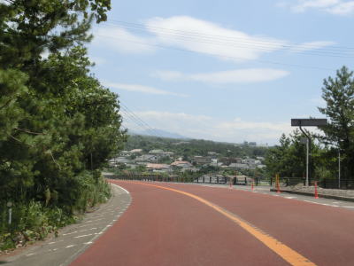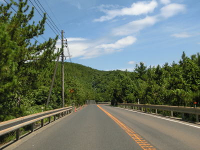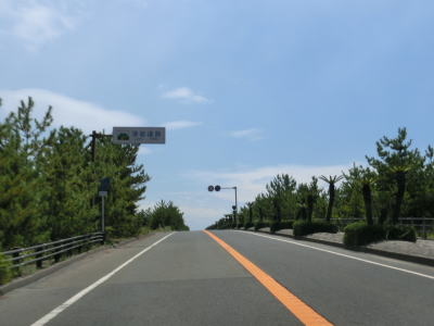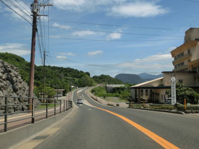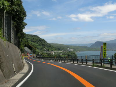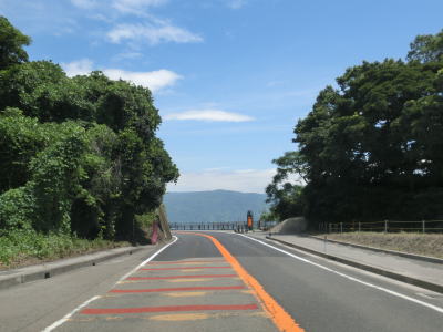| ホテル群を過ぎて左にカーブすると大観橋を渡る。橋の下には砂浜があり、そこを掘ると40度程度の湯が湧き出るらしい。かつては温泉保養地だったらしいが、桜島大正噴火の際に埋没したらしい。 大観橋からも緩やかなアップダウンとカーブの走りやすい2車線道路が続いている。観光地であり天候は非常に良いのだが、交通量は少なくハイペースで走る事ができる。そんな道路だが桜島が噴火した際には噴石が飛んでくる可能性あるので注意を要する。もっとも、どのように注意すればよいのかは噴火に慣れていないと分からない。 |