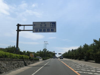 | 袴腰交差点からは上り勾配の直線道路を走り、その途中で道の駅「桜島」を通過する。案内標識に垂水まで21kmと表記されているが、その距離は垂水市の中心部(=市役所付近)までの数字であり、R224の起点までは13km程度である。溶岩道路という愛称の通り、溶岩の上を走っている。 | ||