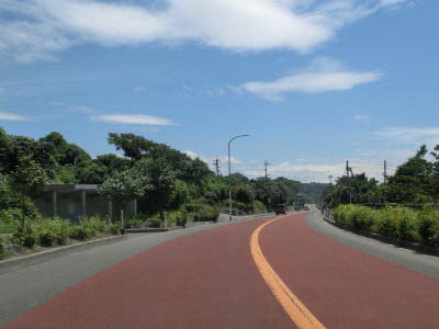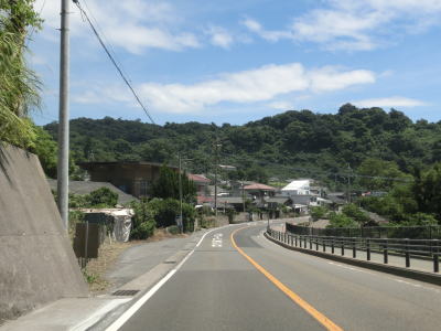 | 上り勾配の直線道路を走っていると海沿いの市道との交差点を左にカーブしながらやや急な勾配を下る。前方に赤水町の集落が見えており、右カーブの後に集落を通行する。集落内には旅の駅「桜島」という物産店があり、昔ながらのドライブインといった感じである。 | ||
