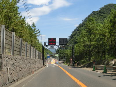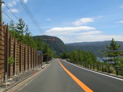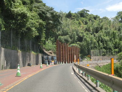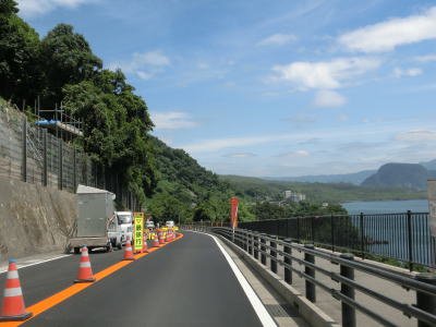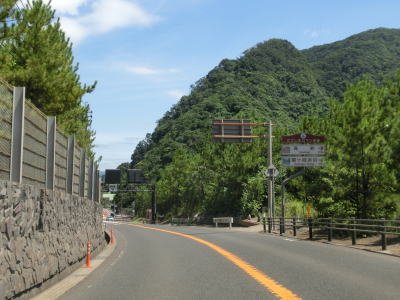 | 観音崎の手前を左にカーブして新しい舗装となり、その状態を走っていると海やその奥の有村崎を見ながら緩やかな勾配を下る。その下り勾配の途中で工事による片側交互通行規制区間を通過する。規制の理由は法面の落石防止工事と思われる。 | ||