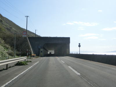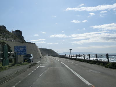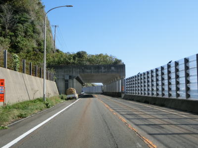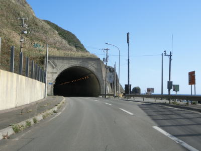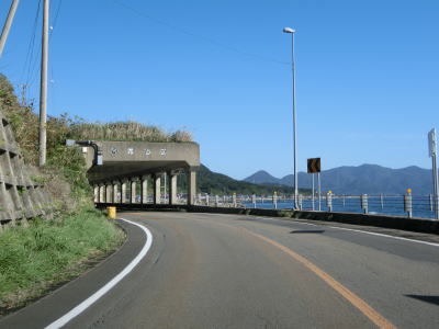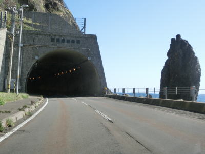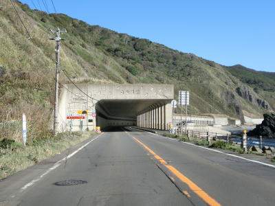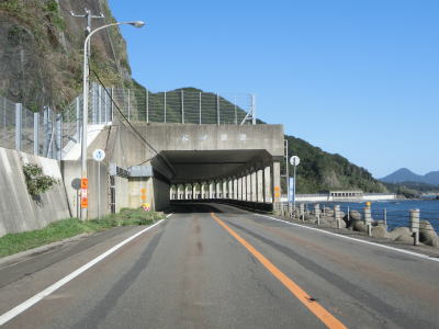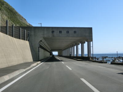 | 白神トンネルを出た後に松浦覆道、戸谷覆道、明神覆道を連続で通過する。松浦覆道の延長は長いが、他の2つのは短い。また、戸谷覆道と明神覆道の間の海側の岩の上に展望台のようなものが見えるが、国道からの入口は確認できなかった。 | ||