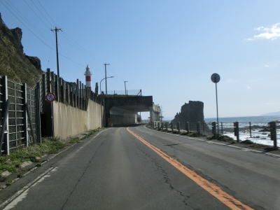 | 白神集落を通り過ぎると同時に道路通行規制区間に入る。海岸線ギリギリを走っているというシチュエーションはこれまでにあったので特に目新しさは感じない。道路そのものも2車線なので走りやすいと言える状況である。公衆トイレと東屋のある白神岬展望広場の前を通るが、この展望広場自体は岬から1.2km程離れた位置にある。展望広場から程なくして陣屋覆道をくぐる。 | ||