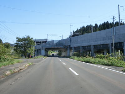 | 萩茶里橋からは直線道路が続いており、程なくして北海道新幹線の高架をくぐる。その手前には青函トンネルに出入りする新幹線の車両を撮影するための撮影台が設置されている。また、高架のすぐ東には道の駅「しりうち」があり、そこにも展望撮影台が設置されている。道の駅を過ぎてからも直線的で見通しの良い2車線道路が続いている。 | ||