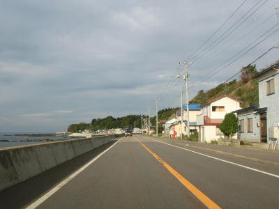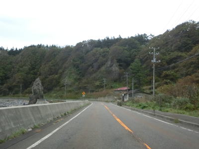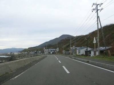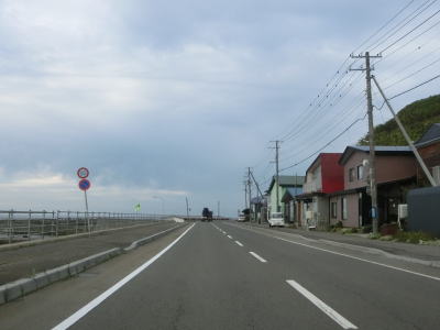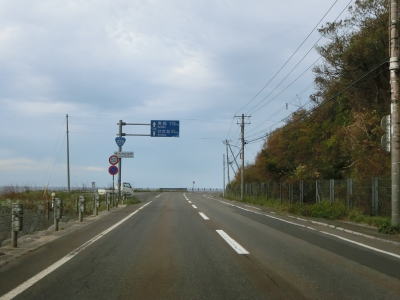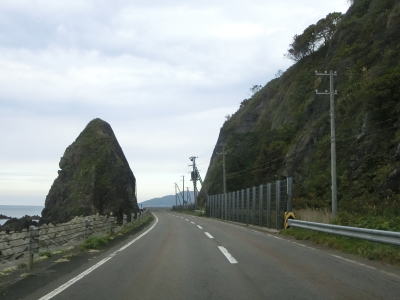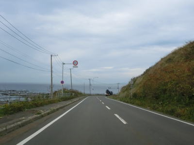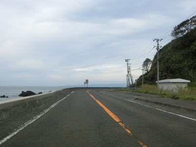| 貝取澗川に架かる白泉橋を渡って左にカーブすると前方に奥尻島が見えるようになる。島との直線距離は30km程度である。奥尻島を左手に見ながら北の方角に向かって走る。走行した日は風が穏やかだったが、荒れていると波飛沫が路面にまでかかりそうな場所である。 | ||