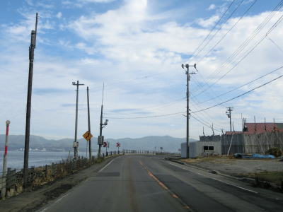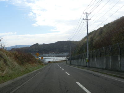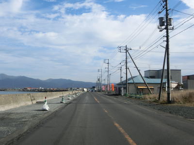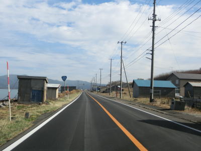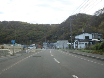 | 道路通行規制区間内と言っても平坦で緩やかなカーブの多い2車線となっている。沿線に家屋はほとんど見られないが、内陸側の高台の町道周辺には家屋がある。道路通行規制区間が終わってからも道路状況に変化はなく海に沿った快走路を走る。 | ||