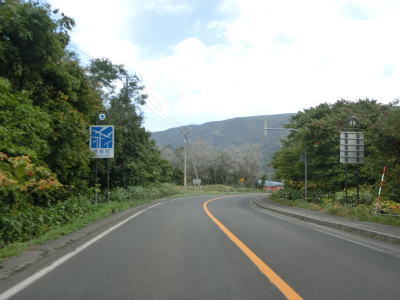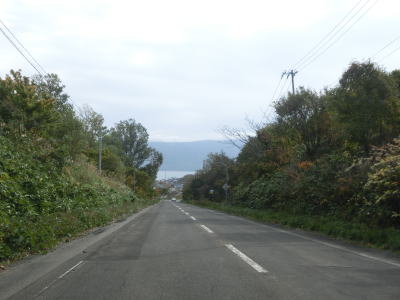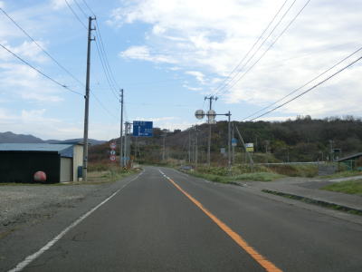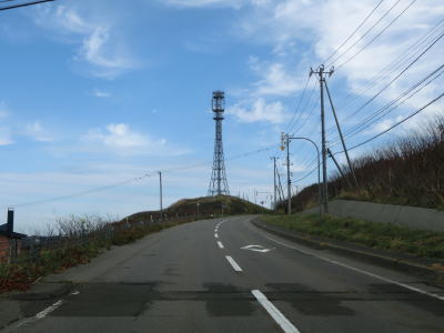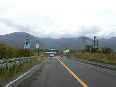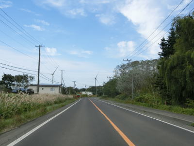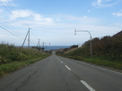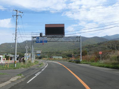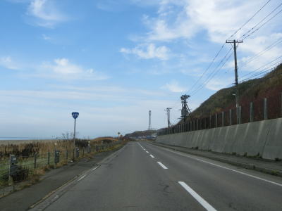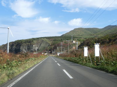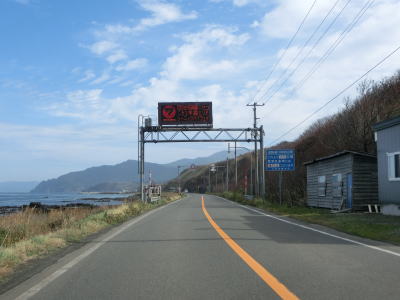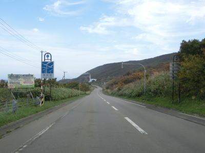 | アップダウンしている直線道路を走る。7,8台の高所作業車を見かけたが、前述の停電の復旧工事の車両と思われる。南後志清掃センターが見えた所で寿都町に入る。清掃センター付近は緩やかな下り勾配となっており、正面に海が見える。海の近くの高台とあって風が強いようで横風に注意を促す看板が立てられている。 | ||