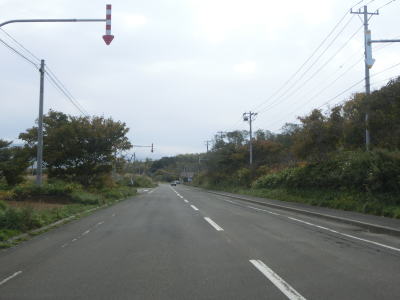 | 勾配を下り切って平坦になる所で北海道r9交差点を通過する。r9の行き先が戻る方向の寿都町の中心部に戻る方向とあって案内標識は設置されていない。その後しばらく海に沿って走った後に矢太川の河口付近で海岸線から離れる。矢太川の左岸流域を走っていると町道との交差点を通過する。寿都鉄道跡が並走しているため、交差点の近くの町道には線路が存在していたと思われる。 | ||