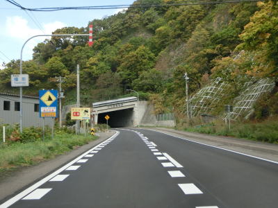| 能津登集落が途切れた先で能津登トンネルをくぐって蘭越町に入る。トンネルが供用される以前は海沿いに道路があったが、尻別岬の根元の旧能津登トンネルが閉塞されており、また寿都町側は廃道と化しているので通行できない。 能津登トンネルを出てすぐに北海道r267港町交差点を通過する。左折側の道路が旧道であり、旧トンネルの手前までは行く事ができるようである。港町交差点を過ぎて磯谷橋を渡る。 |