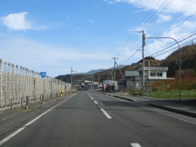 | 美谷稲荷神社の前でやや急な右カーブを曲がる。美谷集落の北端で道路通行規制区間に入る。閉鎖用のゲートは設置されているものの、その手前には転回スペースがない。ここに限らず北海道の国道には手前に転回スペースのないゲートが多く見られる。 | ||