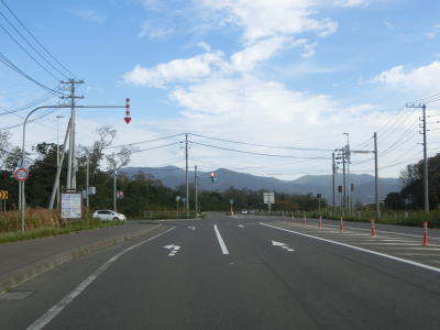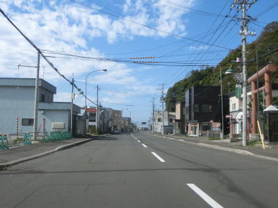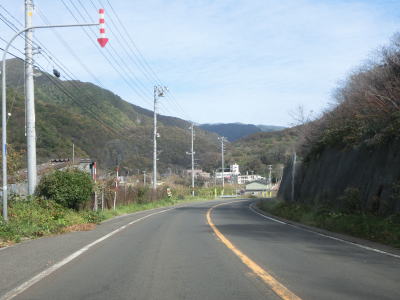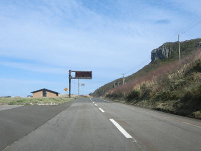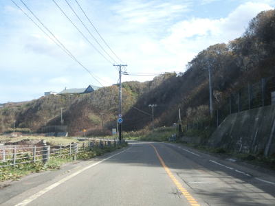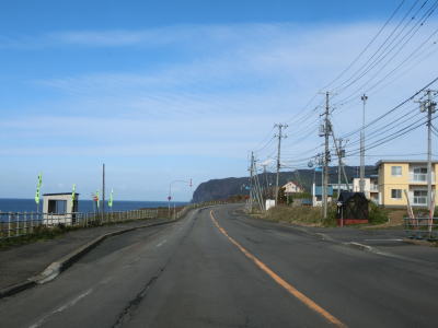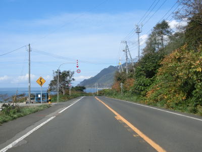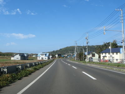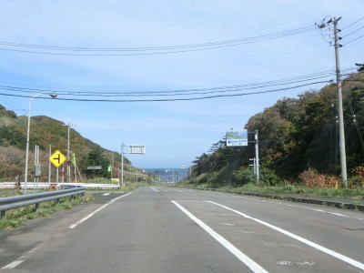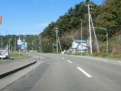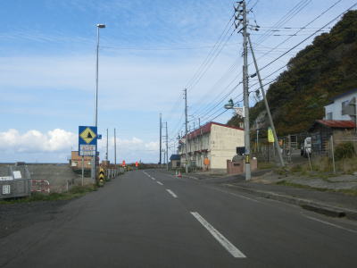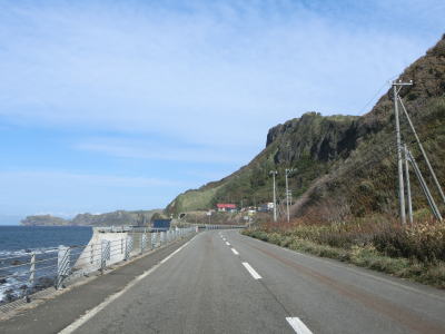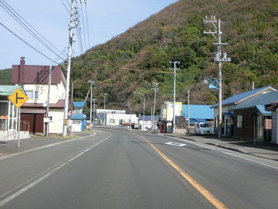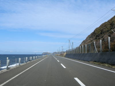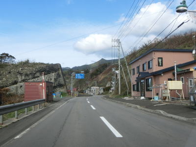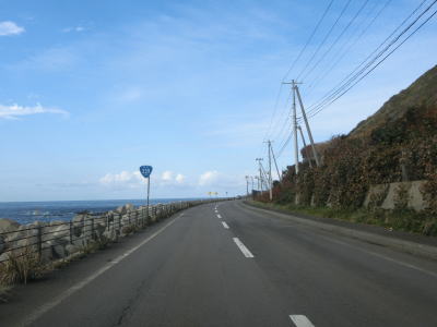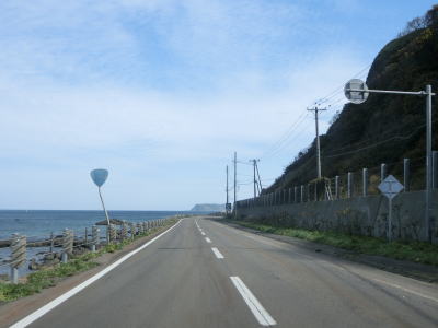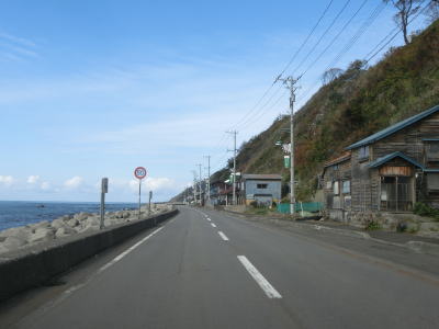 | 神恵内交差点を過ぎてすぐに神恵内村役場の前を通過する。役場の真ん前とは言え車線幅が広くて走りやすい道路状況である。その後、幅員減少の警戒標識が現れるが、車線幅が狭くなるだけで普通の2車線道路が維持されている。神恵内漁港を通り過ぎてからは海岸線に沿っており、平坦でカーブの少ない2車線道路を快走する。 | ||