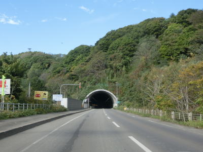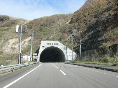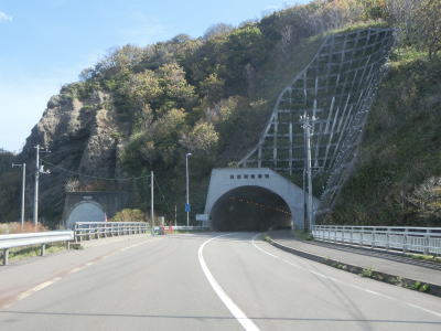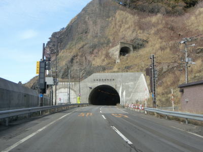 | 道の駅の直後に大森トンネルに入り、次いでキナウシトンネル、マッカトンネルと長大トンネルを3つ連続で通過する。キナウシトンネルの南側坑口の海側に二代目キナウシトンネル、そして上には初代キナウシトンネルが確認できる。初代は相当古いのだろうなと思いきや、1968年完成と驚くほど古いという訳ではない。二代目は1985年に、現在のものは2002年に完成している。他の2つのトンネルにも旧道はあるがどれも通行不能である。 | ||