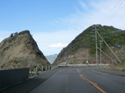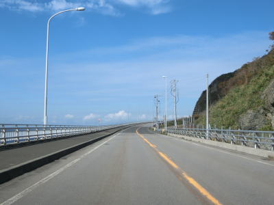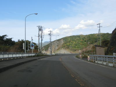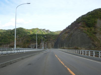 | 茂岩トンネルを出るとすぐに神泊大橋を渡る。その北詰に神恵内村の境標識が立っているが、村境は茂岩トンネルの中にある。逆の泊村の境標識は茂岩トンネルを出た南側に立てられている。祈石駐車場の前を過ぎると祈石大橋と弁財澗大橋を渡る。 | ||