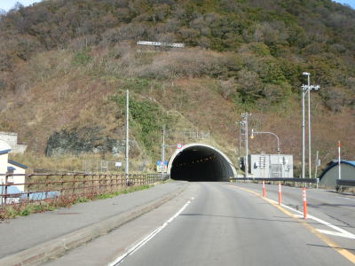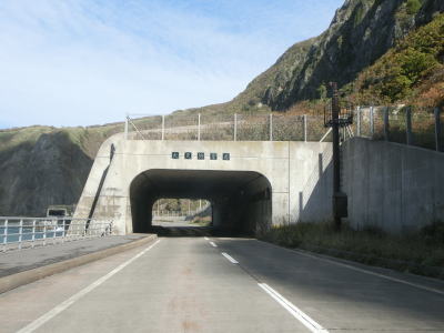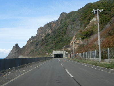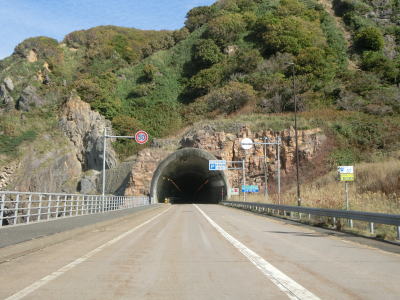 | 来岸集落に入ってから来岸トンネルをくぐる。比較的短いトンネルだが旧道のトンネルは閉塞されているため通行できない。来岸集落を通り抜けた後に武威トンネルと西河トンネルをくぐる。これらのトンネルにも海側の旧道のトンネルが閉塞されている。 | ||