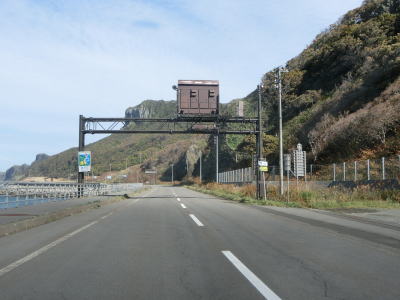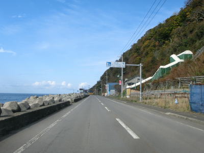 | 日本海に沿った2車線道路を淡々と走っていると5%とやや急な勾配を上った後に道の駅「オスコイ!かもえない」を通過する。この道の駅は2004年の台風18号の高波によって被災して長らく休止状態であったが、場所を移転したうえで2010年に再開されている。 | ||
