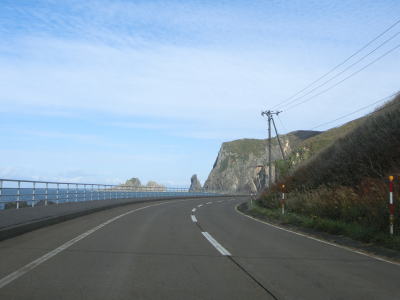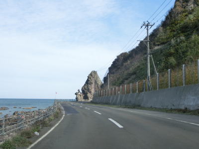 | 沿線に家屋が点在する尾根内集落を通り抜けながら海岸線ギリギリを走る。前方には神威岬と神威岩、灯台が見えてくる。日本海沿岸を通っているR229の中でも最も有名な場所が神威岬ではなかろうか。 | ||