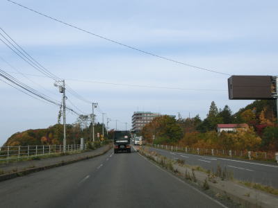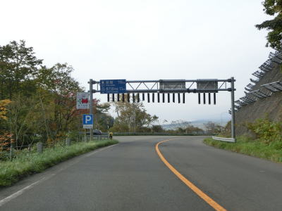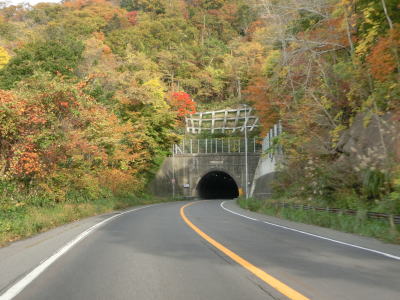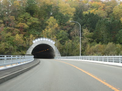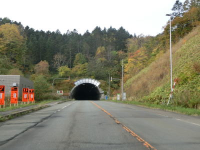 | 緩やかな勾配を上っていると持辺橋を渡り、その先で豊浦トンネルをくぐる。このトンネルにも3.9mの制限高が設けられている。豊浦トンネルを出てからも上り勾配が続いており、程なくして内浦湾が望めるようになる。高低差があるため視認できないが、海寄りにはJR室蘭本線がある。 | ||