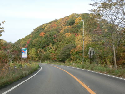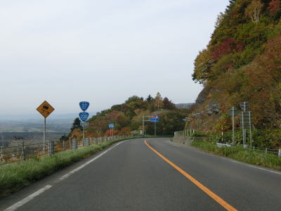 | 長万部町の町境標識を過ぎると左側の景色が開けて内浦湾まで見渡す事ができる。右にカーブして海から離れた後に左のヘアピンカーブを曲がるが、ヘアピンカーブ部分には中央分離帯が設置されている。通常の対面2車線道路に戻ってからは緩やかな勾配を下り、左カーブが終わると直線道路になる。右側に駐車帯が設置されているが、駐車枠は大型車両用のみである。 | ||