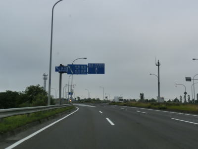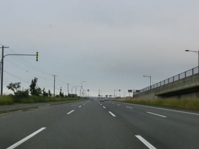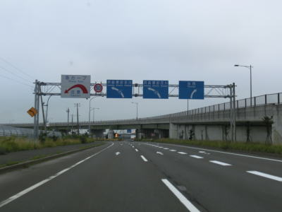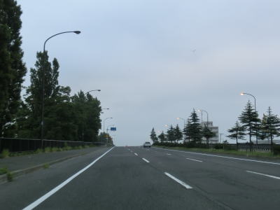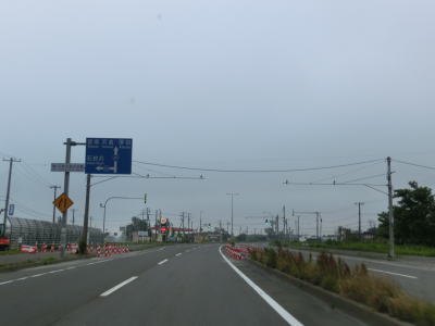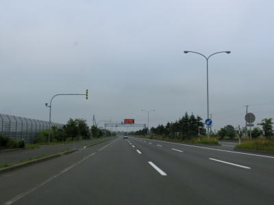 | 花畔IC以降は片側2車線になるものの平坦かつ直線という状況は変わらない。工業団地を通り抜けているため平日の昼間であれば大型貨物車両の通行が多いものと思われる。工業団地の北の出入口である北海道r255新港東交差点を過ぎて約900m先のr255花畔交差点で車線が減少する。r255が左側に交差しているのだが、左側車線が左折専用になるという訳でもない。路面に矢印の表記はなく左右両方の車線が直進できるのだが、交差点の先はいきなり対面2車線になっているため合流車両に注意しなければならないという、ある意味難易度の高い交差点である。土地柄、観光客の乗るレンタカーが多い事を考えると慌てて合流するというケースも少なくないと思われる。 車線が減って2車線になってからも快走路と言える状況は続いている。花畔交差点のすぐ先に通行止用のゲートが設けられているのだが、場所が場所だけにどのような災害を想定しているのだろうか気になるところである。 |