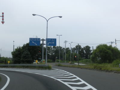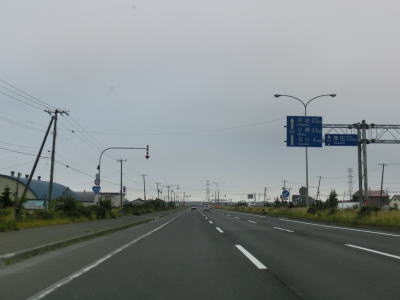 | 茨戸川の右岸に移ってからも片側3車線という道路状況には変化はないが、周囲には住宅街ではなく牧草地が広がっている。やや低い防雪柵が設けられた道路を北上しているとR337との生振ICに差し掛かる。ここで3車線のうちの右側車線はR337への右折車線となるため、R231のトレースには左側の2車線を走っている必要がある。さらに付け加えるとR337との合流後に左側車線が減少するため、真ん中の車線を走っていれば車線変更なしでトレースできる。 | ||