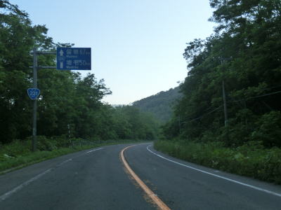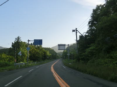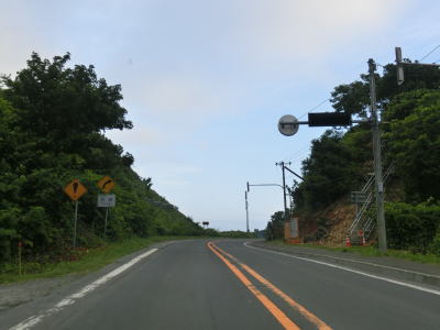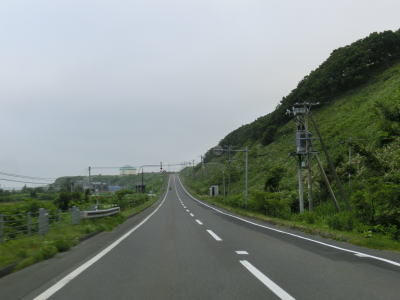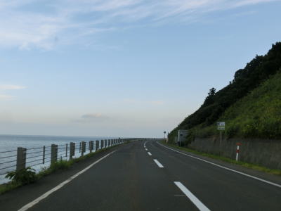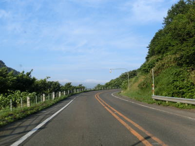 | アップダウンはあるものの非常に緩やかでエンジン付きの乗り物で走っている限りは全く気にならない。カーブも緩やかなものばかりである。花畔交差点から約12.6kmで長い下り勾配の先に望来浜の集落と海が視界に入ってくる。ここからは全てではないが概ね海沿いを走るであり、南北を結ぶ道路としてはかなり内陸まで入らないと代替路がない区間である。 | ||