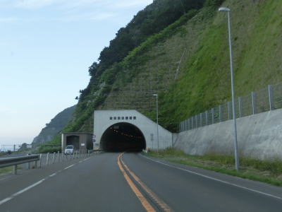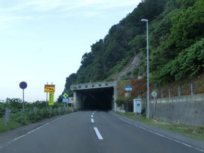 | 海沿いを走っていると滝の沢隧道、太島内トンネル、新赤岩トンネルを相次いでくぐる。滝の沢隧道は1242m、太島内トンネルは2454mと意外に長大なトンネルで、新赤岩トンネルも963mとそれなりに長い。また新赤岩トンネルの海側には抗口が塞がれている旧トンネルが見える。 | ||