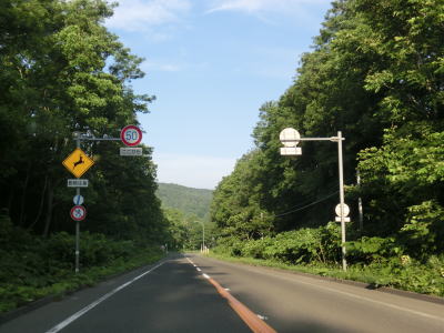 | 望来浜集落を通り過ぎると右にカーブして蛇行する望来川の流域を内陸に向かって進み一旦海から離れる。その後戸田記念墓苑公園の北で左急カーブを曲がり、上り勾配を走っていると嶺泊覆道を通る。内部は急な左カーブのため追突に注意を促す標識が立てられているが、そこにはトンネルとなっているが、名称は覆道、つまりスノーシェッドである。 | ||