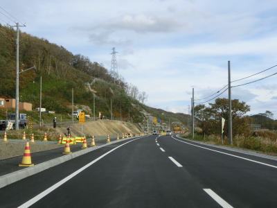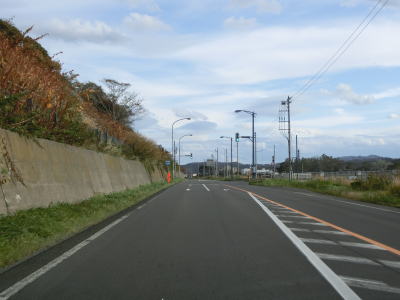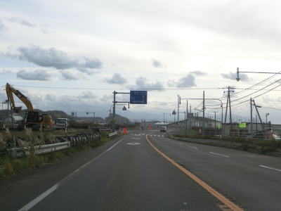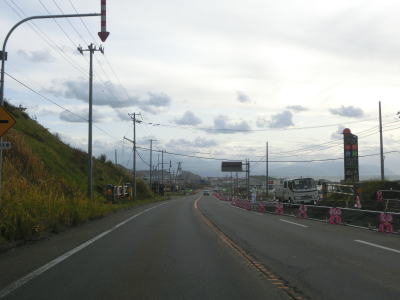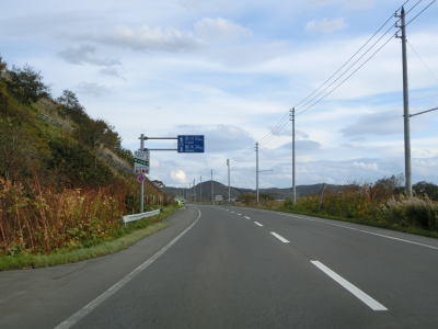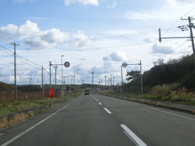 | 左側の高台に風力発電用の風車が建っているのが確認できるが、落雷でブレードの一部が破損したため休止期間を経て廃止となっているようである。そのため4基ともブレードが取り外されていた。 狭い平地を走っているが、勾配もカーブもほとんどないため走りやすい道路状況と言える。北海道r958交差点を通過するが、並走していた国鉄羽幌線跡はその手前から東に逸れて内陸に向かっている。r958交差点を過ぎてすぐに閉鎖用ゲートが設置されており、道路通行規制区間の起点を通過する。対象区間の距離は4.9kmである。 |
