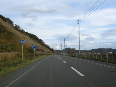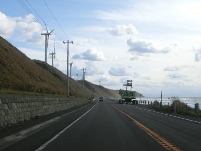 | R239交差点からはR239が重複しているが、おにぎりや案内標識などに現れていないため重複区間である事は認識し難い。前方に多くの風車を望みながら2車線道路を走っていると緩やかなS字状のカーブを通過する。海岸に接近してからは海のすぐ傍を走る。内陸側は高台となっておりそこに苫前グリーンヒルウインドパーウの風車が建てられている。 | ||