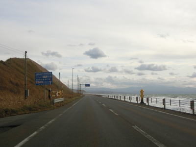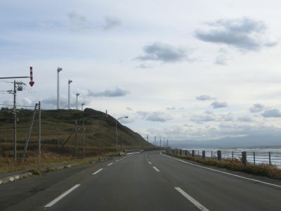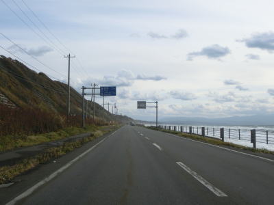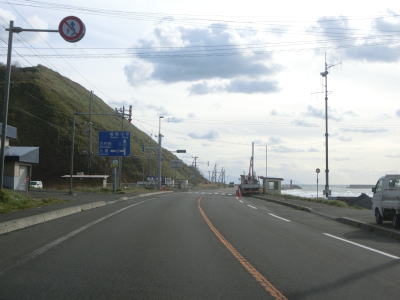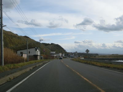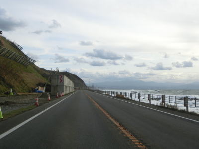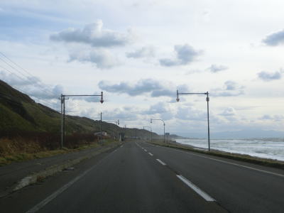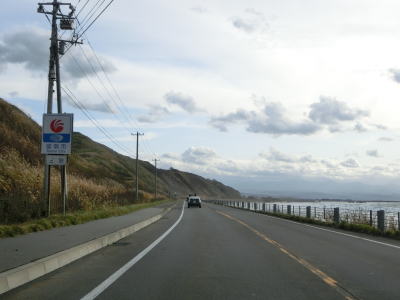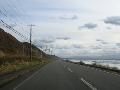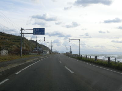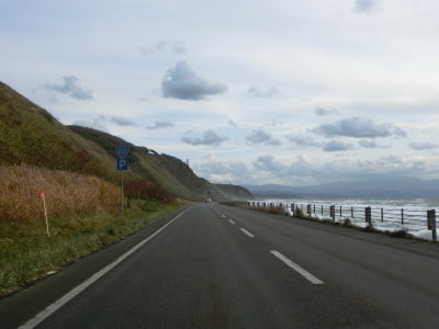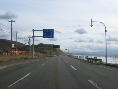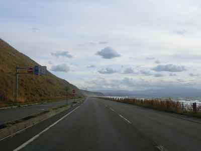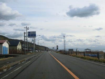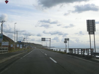 | 旧鬼鹿村の中心部を通り過ぎて少し走ると道の駅「おびら鰊番屋」を通過する。駐車スペースのみの駐車帯はいくつか設置されているが、公衆トイレは少ないので貴重な休憩場所である。道の駅からも日本海に沿った2車線道路が続いている。海の向こう側に陸地が見えるが、これは雄冬岬の一部(増毛町)と思われる。 | ||