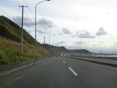 | 通行規制区間に入ってすぐに内陸側に駐車帯が設置されているが、細長い敷地は一方通行で真ん中に出口がある。駐車帯を過ぎてからも走りやすい2車線道路が続いているが、海が近いため荒天時には越波する事が考えられ、それが通行止の原因にもなると思われる。 | ||