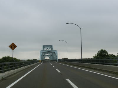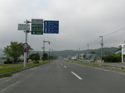 | 4条8番交差点からは2車線となって市街地の南部を走り抜けて深川橋を渡る。走行時は上流側の欄干を工事しており若干狭くなっていた。その後しばらくは住宅がそこそこ立っている中を走るが、進むにつれてその密度は疎らになっていく。 | ||