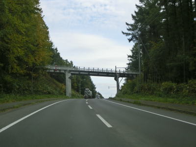 | 上下線が分離した信部内橋を渡ると紋別市に入る。紋別市と湧別町の境は未確定のため、とりあえずシブノツナイ川を境として標識を立てているといったところだろう。なお、欄干には転落防止用にしては高く間隔の粗い支柱とワイヤーが欄干に取り付けられている。これはシマフクロウが橋上を飛んで車両に衝突しないようにする目的で設置されている。 コムケ湖の南はカーブしているものの曲線半径が大きく緩やかなので走りにくさは感じない。JR名寄本線跡と並走しながらアップダウンのある2車線道路を淡々と走る。オホーツク沿岸を走る数少ない道路ながら交通量は少ない。 |