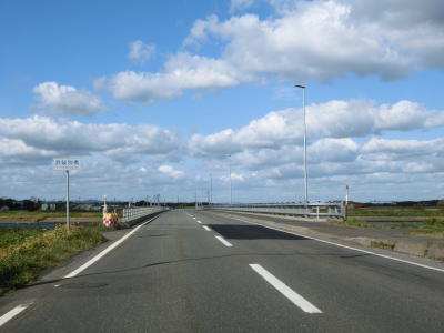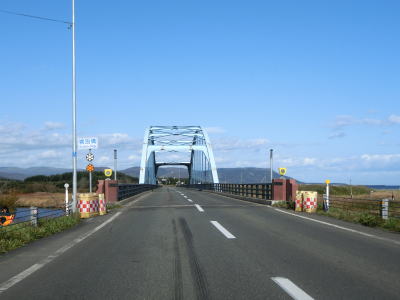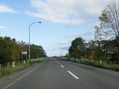 | 幌内集落を通り抜けると上下線が分離している幌内橋を渡る。稚内方面の橋だけだったものに網走方面の橋を架けたものと思われ、前者は1963年、後者は2006年の竣工である。橋との間が少しあいているため、前後には中央分離帯が設置されている。 幌内橋の直後には北海道r60交差点があり、交差点からの緩やかなカーブが終わるまで中央分離帯が設置されている。対面2車線道路に戻ってからは見通しの良い状態をひたすら走って枝枝幸集落を通り抜ける。枝枝幸は“えだえさし”と読み、決して誤記ではない。 |