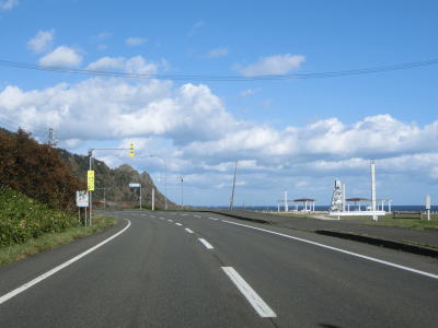 | 目梨泊集落を通り過ぎてすぐに北見神威岬公園の前を通る。北緯45°国際記念公園と同様に駐車場とトイレ、東屋のみの簡素な公園であるが、神威岬が見えるロケーションのせいもあって休日ともなれば停まっている車は多い。北見神威岬公園を過ぎてすぐに神威岬を通る旧道との交差点を通過するが、閉鎖されており車両での進入はできない。現在の国道は交差点の直後に閉鎖用ゲートが設置されている。 | ||