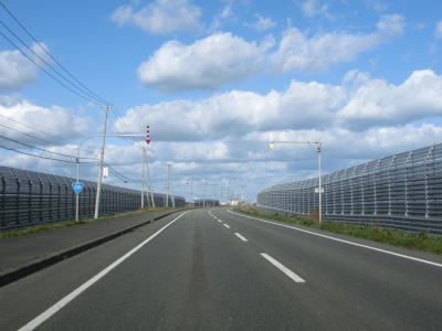 | 海側の防雪柵に加えて内陸側にも設置された区間の後に内陸側のみとなる。海、山の方向を問わず強い風が吹きつける地域だと推測できる。北海道r586交差点を通り過ぎて少し走ると浜頓別ウィンドファームの風車群を見る事ができる。これらの風車は興浜北線跡に沿って一列に並んでいる。 | ||