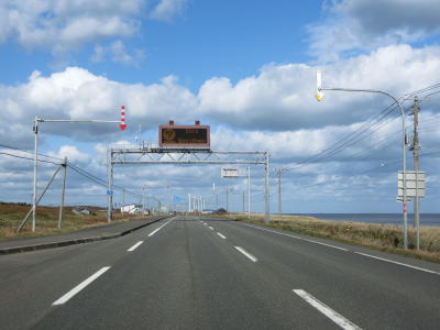 | 緩やかな勾配を上っていると北オホーツクトンネルをくぐって浜頓別町に入る。枝幸町と浜頓別町の境のうち、斜内山より西側(つまり斜内山から神威岬にかけて)は境界未定地域だが、北オホーツクトンネル内に町境があると考えて問題ないだろう。トンネルを出てすぐに集落が存在しており、国道に沿って細長い集落を走り抜ける。海から強い風が吹きつけるためか、かなりの距離に渡って防雪柵が設置されている。 | ||