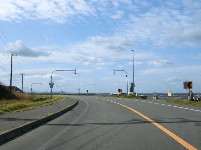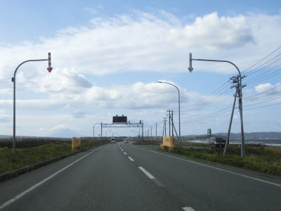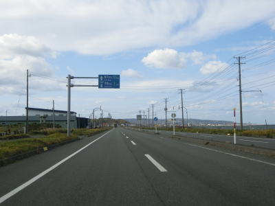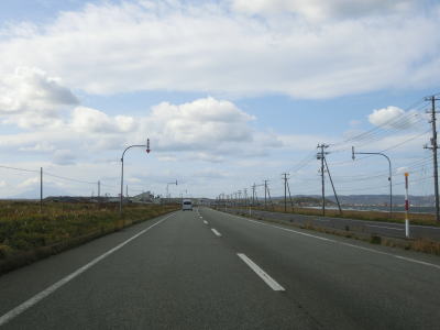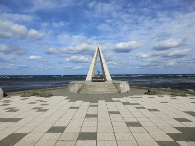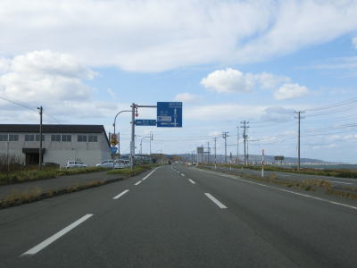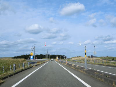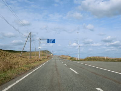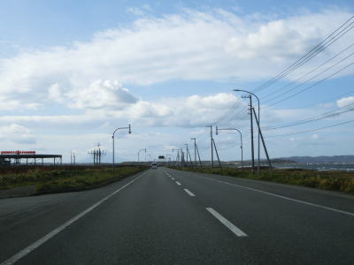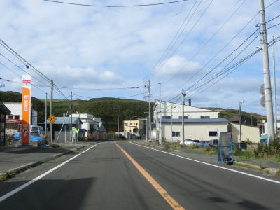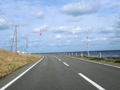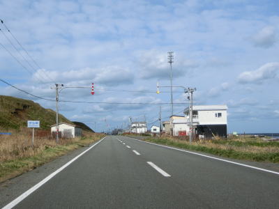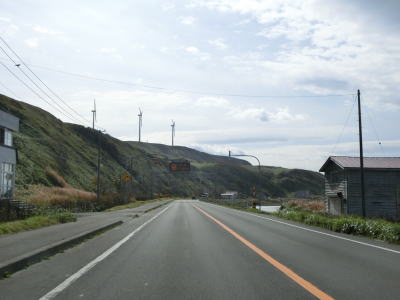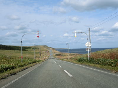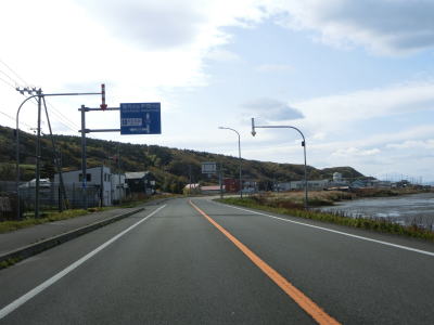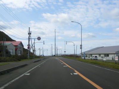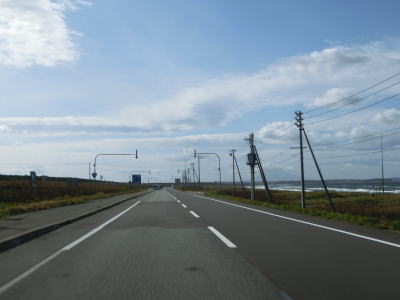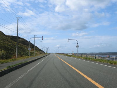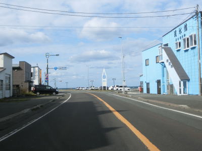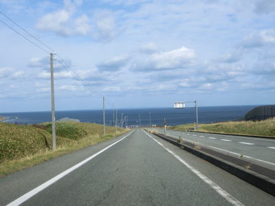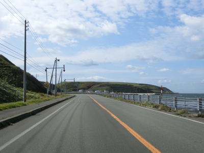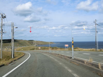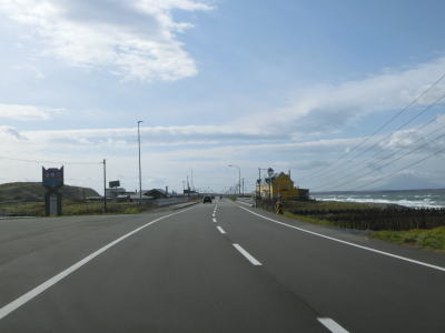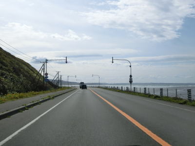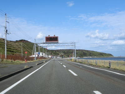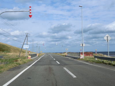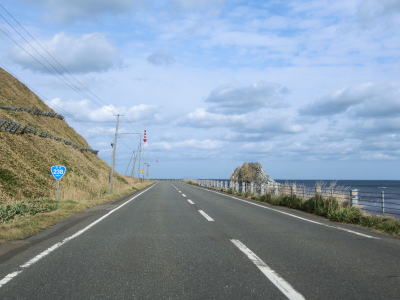 | 宗谷岬を過ぎてからも海沿いを走っているが、宗谷岬と樺太を結ぶラインが日本海とオホーツク海の境のため、宗谷岬から東は日本海に沿っているという事になる。平坦だがカーブの多い2車線道路を走るが、平日という事もあって好天の割に交通量は少ない。間宮林蔵渡樺出港の地の石碑の前を左にカーブしながら通過して清浜集落に入る。 | ||