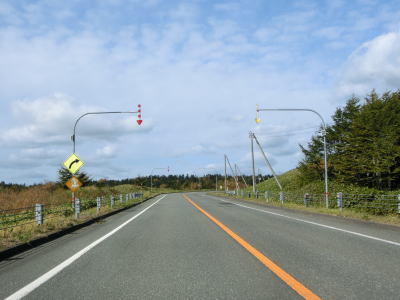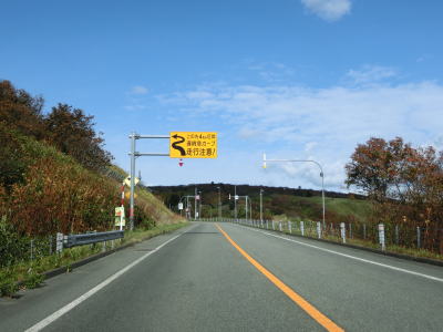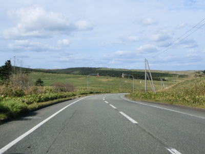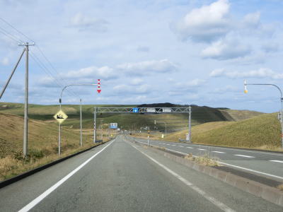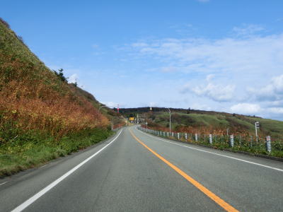 | 右カーブを曲がりながら6%とやや急な勾配を下る。起伏のある宗谷丘陵を走っているため道路にもアップダウンがある。丘陵地帯は樹木が少ないため地形の起伏具合が良く見える。北東に目を向ければオホーツク海が広がっている。 | ||