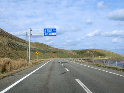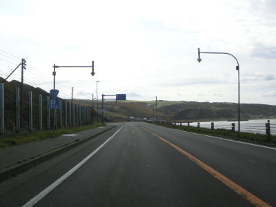 | 反対側車線にある駐車帯を通り過ぎると上り勾配となり、中央分離帯と同時に登坂車線が現れる。左、右とカーブした後に登坂車線が終わるが、中央分離帯は残っており片側1車線道路になる。宗谷丘陵展望パーキングを過ぎると反対側車線に登坂車線が設置されている。オホーツク海を目の前に望みながら左カーブを曲がる。 | ||