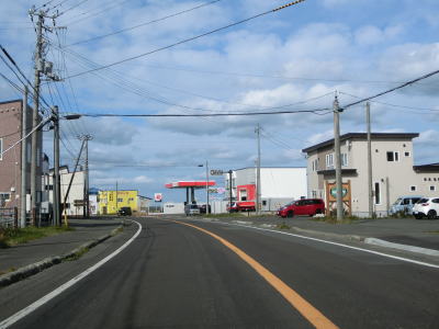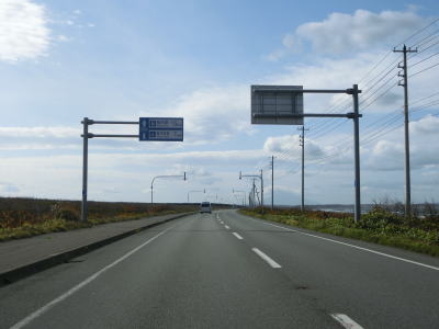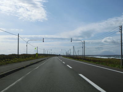| 利尻富士と呼ばれる利尻山らしき山影を望みながら海岸線沿いを走っていると北海道r1077交差点を通過する。オホーツク海沿岸での交差点との距離はR238が約32kmでr1077が約21kmと後者の方が10kmほど短い。r1077交差点からも海に沿っているが、カーブはほとんどなく平坦なので非常に走りやすい道路状況である。 | ||